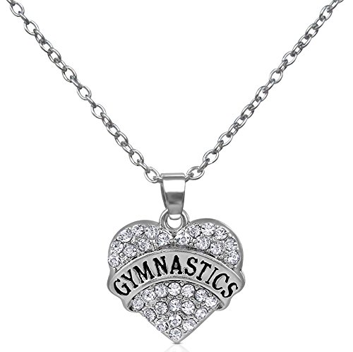 Heart pendant with stamped banner that reads "GYMNASTICS" measures just over 3/4" wide x 3/4" tall
