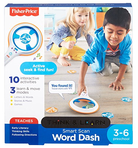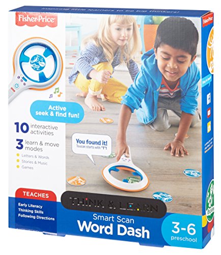 With 9 Smart Discs and 3 learn & move modes of play, Smart Scan Word Dash gets kids' minds (and bodies) moving in so many fun ways! Spread out the Smart Discs on the floor, pick a play mode and see kids go! With the Smart Scanner in hand, they'll be prompted to answer questions, build stories, play games and more with objects on the Smart Discs – making countless connections as they learn the basics of literacy right on the "spot!" 1. Letters & Words. Directed play gets kids making connections between the letters, words & pictures they find on the Smart Discs. "I'm looking for the jungle." Or "Find the letter J." 2. Stories & Music. Encourages kids to come up with silly stories & poems, and even create their own songs in this open-ended play mode! "There was an old lady who swallowed a _____. She swallowed the ____ to catch the _____." By scanning the discs, the words kids choose become part of the story. Take the learning one step further and create music by scanning the Smart Discs and having the disc's sound effects become part of the song! 3. Games. Kids will enjoy playing new versions of some of their favorite games like "Red Light, Green Light" and "Follow the Leader," and new games like "Fast Play"! "Let's see how long it takes you to find the diver. Wow, that took you … 16 seconds! Great job!" When kids are done playing, store all Smart Discs inside the storage case and attach it to the Smart Scanner. It's so easy to clean up - and it's so easy to pick up and play the next time! Smart Scan Word Dash is one of the new Think & Learn toys from Fisher-Price that goes beyond ABCs and 123s to help children learn how to think independently. Each toy fosters 21st century skills like curiosity, experimentation and problem solving in ways kids haven't seen before. They're engaged in hands-on, open-ended discovery that helps them become lifelong learners.Feature