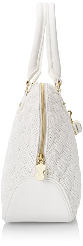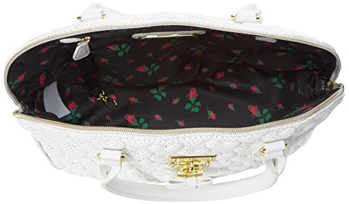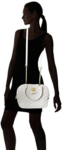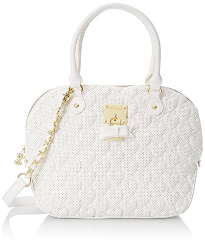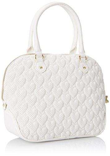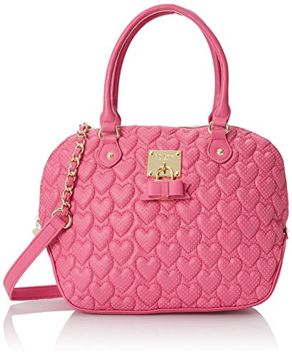 Betsey Johnson quilted faux-leather (PVC) satchel bag. Golden hardware. Rolled top handles; 5.5" drop. Removable chain woven shoulder strap; 23" drop. Logo plaque with locket at front center. Zip around top. Inside, fabric lining; one zip and two open pockets. 10"H x 9"W x 5"D; weighs 1 lb. 8 oz. "Always Be Mine" is imported.Feature