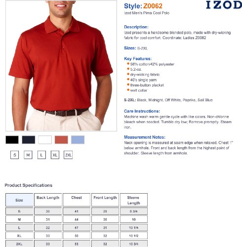 Studio : IZOD Publisher : IZOD Binding : Apparel Product Description Izod Men's Pima Cool Polo Polo Shirt: Izod presents a handsome blended polo, made with dry-wicking fabric for cool comfort. Coordinate: Ladies Z0082; 58% cotton/42% polyester; 5.2-oz; dry-wicking fabric; 40's single yarn; three-button placket; welt collar; Sizes: S-2XL. Care: Machine wash warm gentle cycle with like colors. Non-chlorine bleach when needed. Tumble dry low; Remove promptly. Steam iron. 0