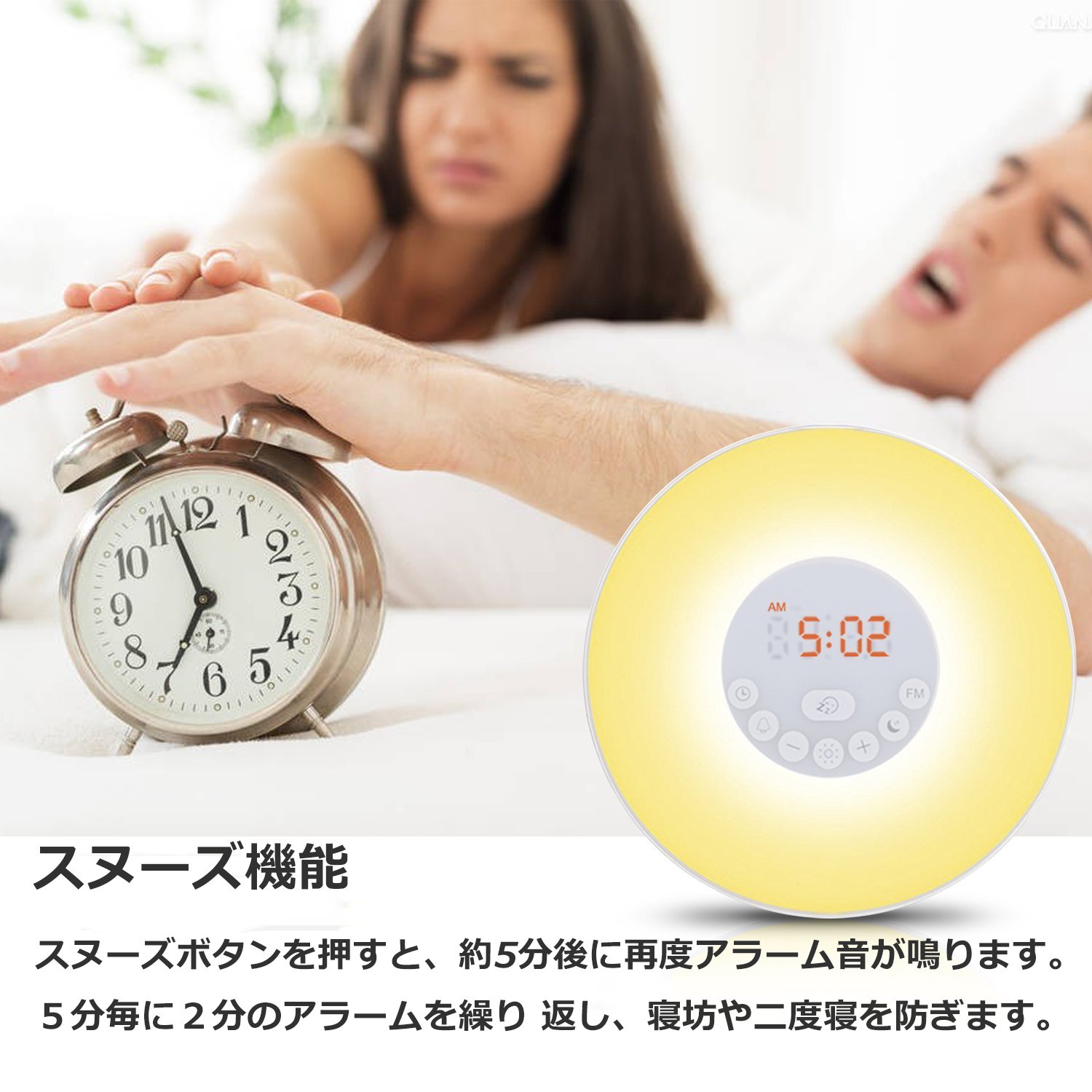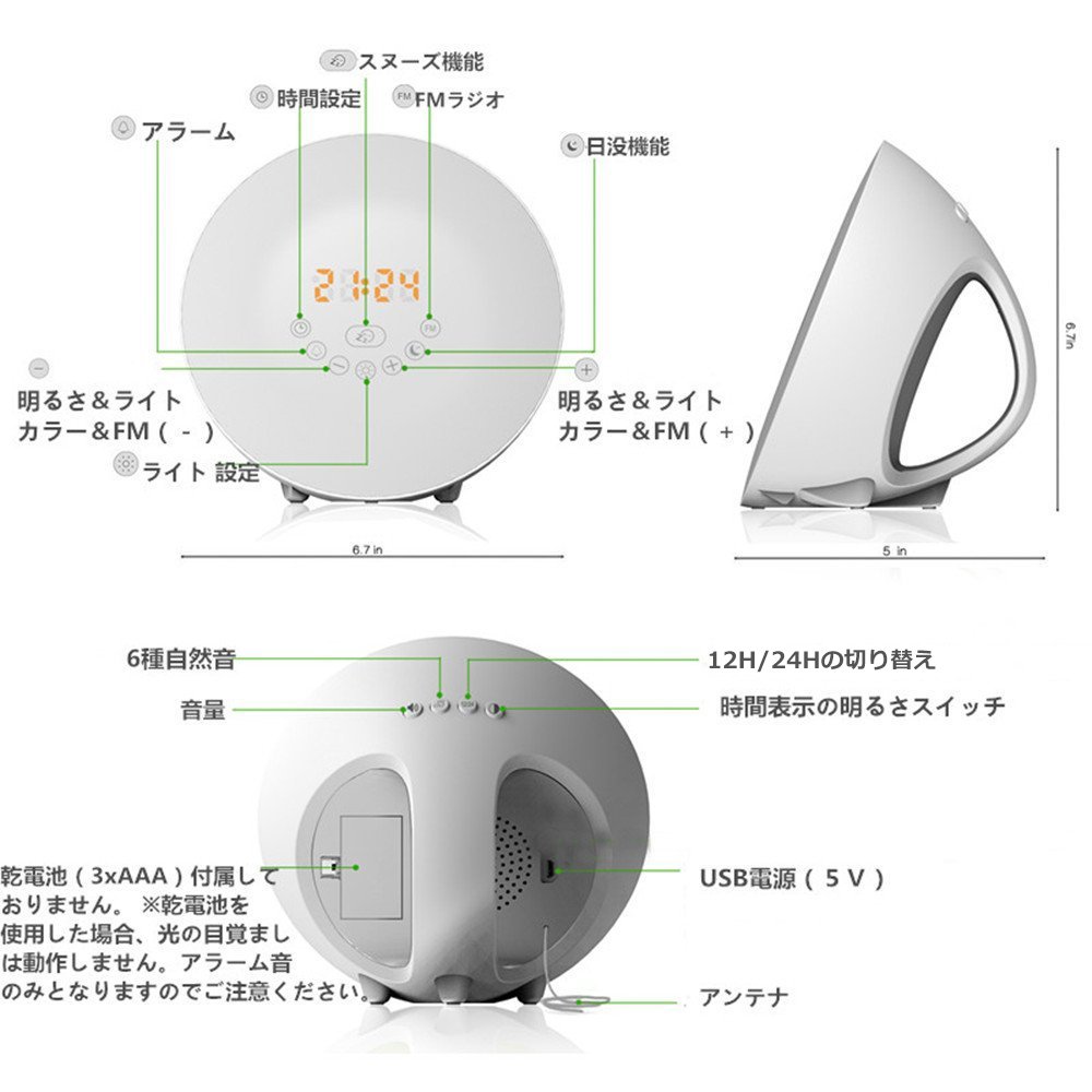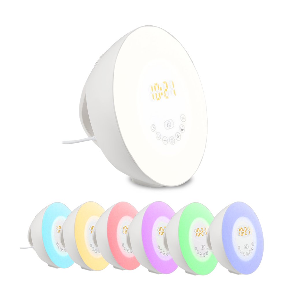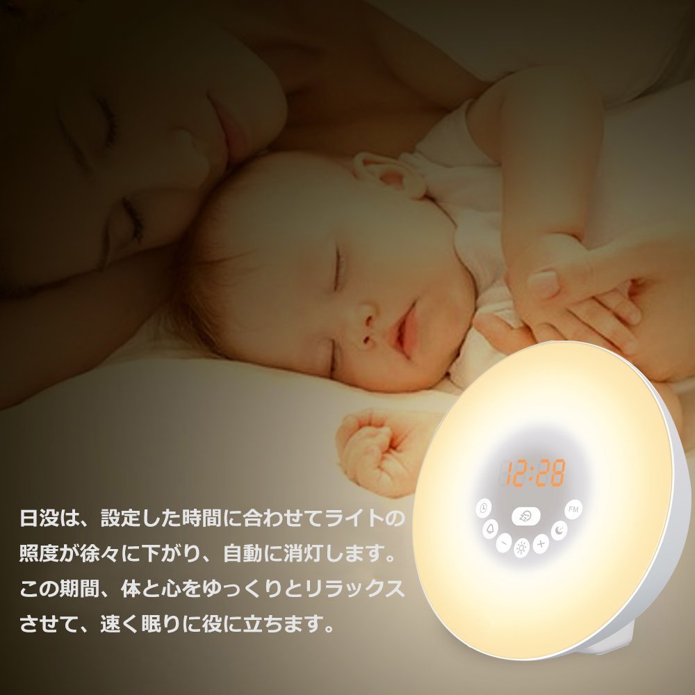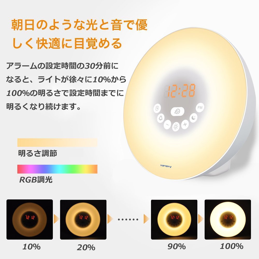 The light gradually increases / weakens the light intensity 30 minutes before the alarm setting, the brightness of the sunrise is lit from 10% to 100%, but the sunset is lit from 100% to 10%