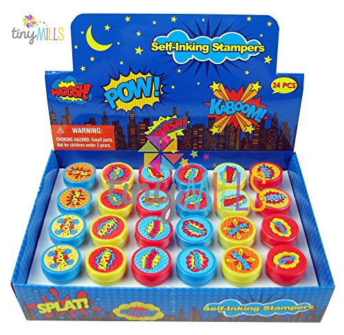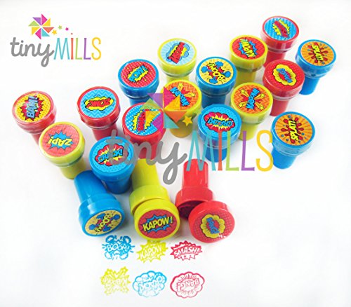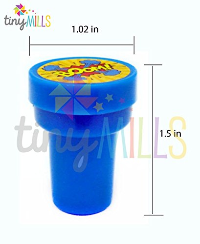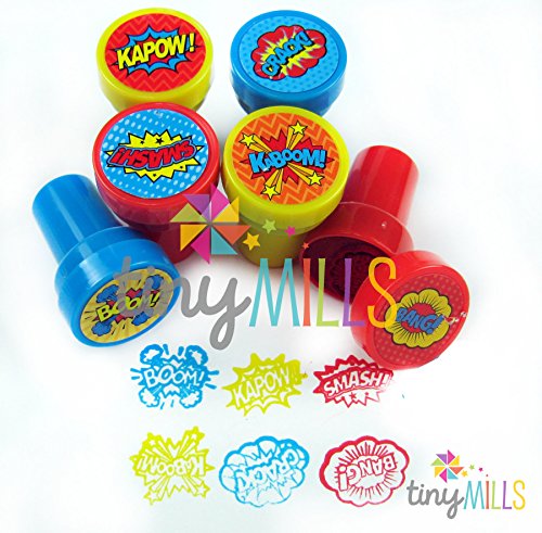 Kaboom! Pow! Smash! Put these awesome superhero word bubbles in your party favor bags! These stampers are also great for school projects, chore charts, creating your party invitations, scrapbooking and decorating stationery. Have this stamp assortment in your party favors bags or the crafts table at your party, for home, in the classroom, or in art class! Our stamps are non-toxic, lead-free have passed all CPSIA and ASTM testing. Safe for children to use. 1.5 inches tall, 1 inch in diameterFeature