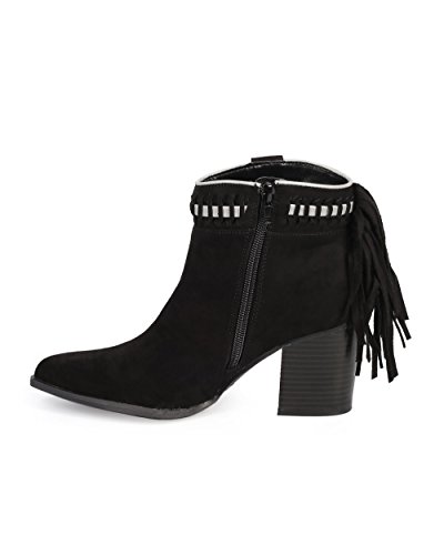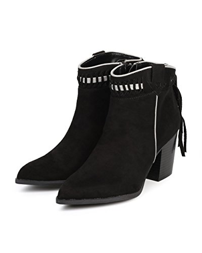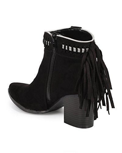 Qupid DE79 Women Suede Pointy Toe Woven Fringe Back Western Bootie - Black