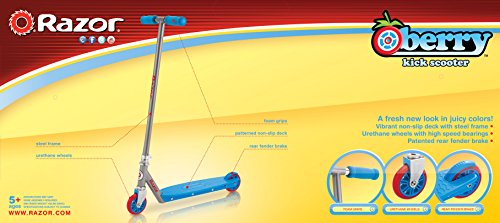 -. Feature : Folding handlebars with foam grips / Razor Berry Scooters feature fun colors, bright plastic decks and vibrant wheels / Lightweight steel frame, handlebar and fork construction / Popular skateboard-style plastic deck with urethane wheels and rear fender brake / Sturdy non-folding rigid down tube