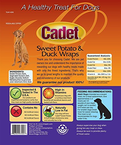 -. Feature : 3 Packages of Cadet Duck & Sweet Potato Dog Treat Wraps; 28 oz Each / Made in China, Inspected and independently tested in the USA / High in vitamins and Naturally low in fat / Contains no artificial colors, fillers, or flavors / Treats for adult dogs over 5 lbs.