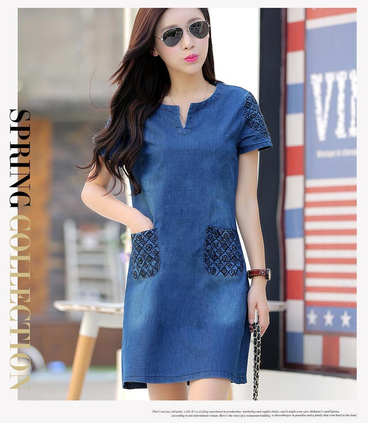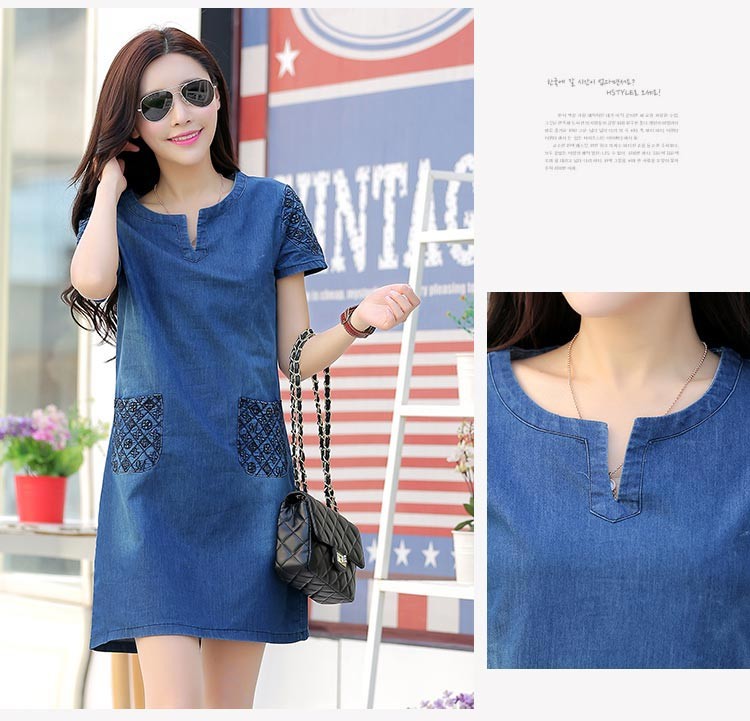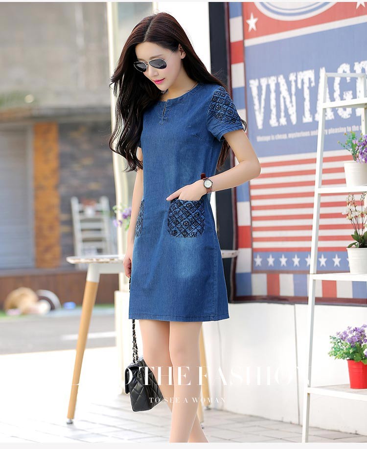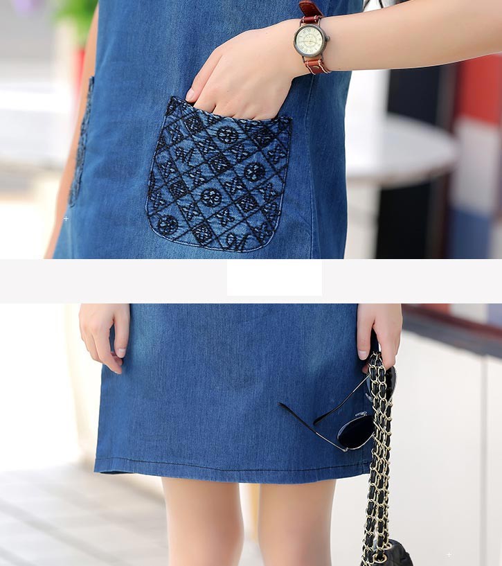 袖とポケットがモノグラム風プリント柄素材のデニム半袖ワンピース♪