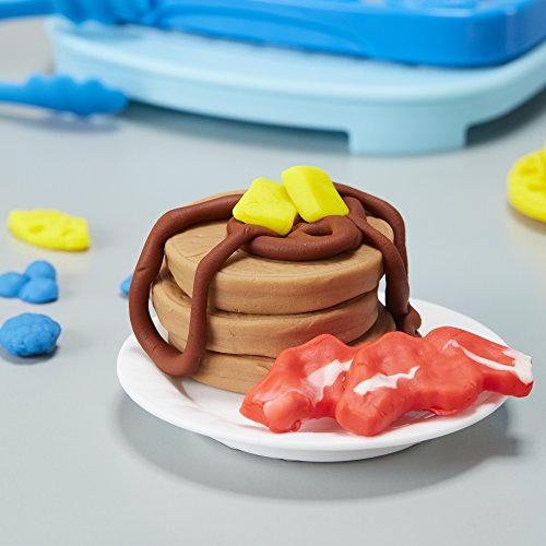 Play-Doh breakfast time is the best way to start the day! Create the most colorful pretend breakfast menu imaginable with the waffle maker and accessories. Not only does the waffle maker shape both square and round Play-Doh waffles, it also creates imaginary toast, pretend pancakes, lots of make-believe toppings, and more. Use the syrup bottle to squeeze silly syrup or fluffy Play-Doh Plus whipped cream on top to complete the creations, then use the tongs, utensils, and plates to show them off. The 3 creation cards can help inspire your junior chef with more fun things to make. There's so much to create, Play-Doh breakfast time might even take up the whole day!