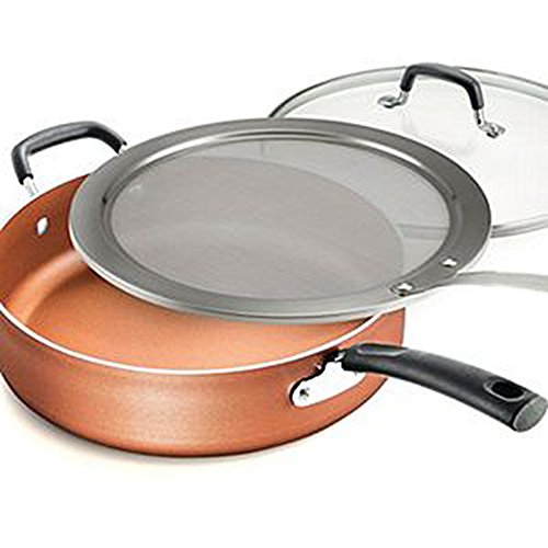 -. Feature : Reinforced ceramic pan, glass lid, splatter screen / Heavy-gauge aluminum / Non-stick interior / Soft-touch handles