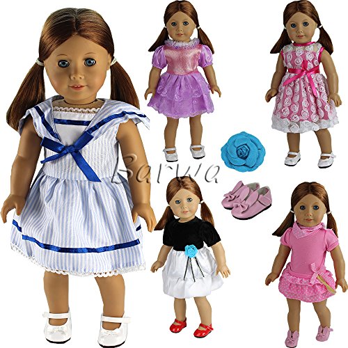 -. Feature : Clothes fit 18 Inch American Girl Doll / Package includes: 5 PCS DRESSES with One Pair Lovely Pink Shoes and Blue Flower Hair Clips for American girl Doll( AS PICTURE) / Doll not included,only Clothes,Hair Clips and One Pair Pick Shoes / All clothes are handmade and good quality,100% Brand new material / Made by Barwa, Leading Doll Clothes Manufacturer.