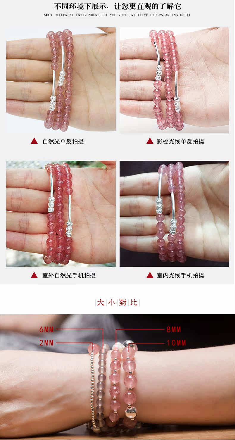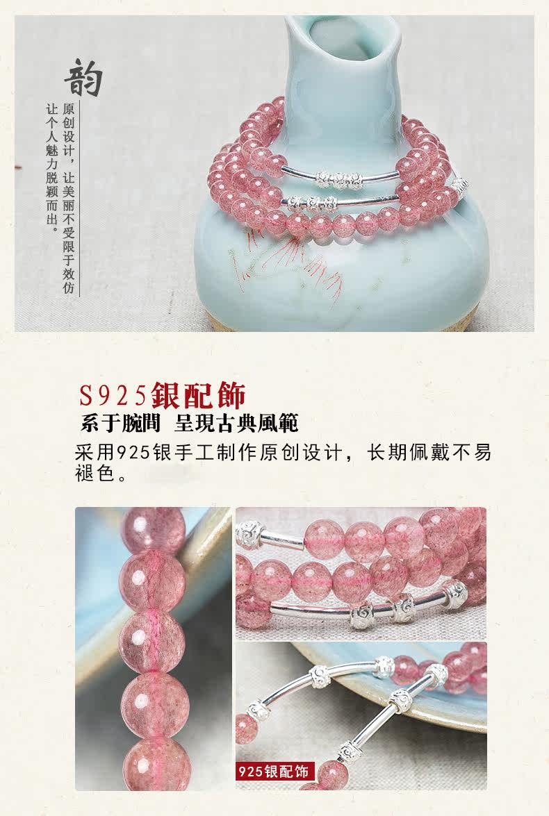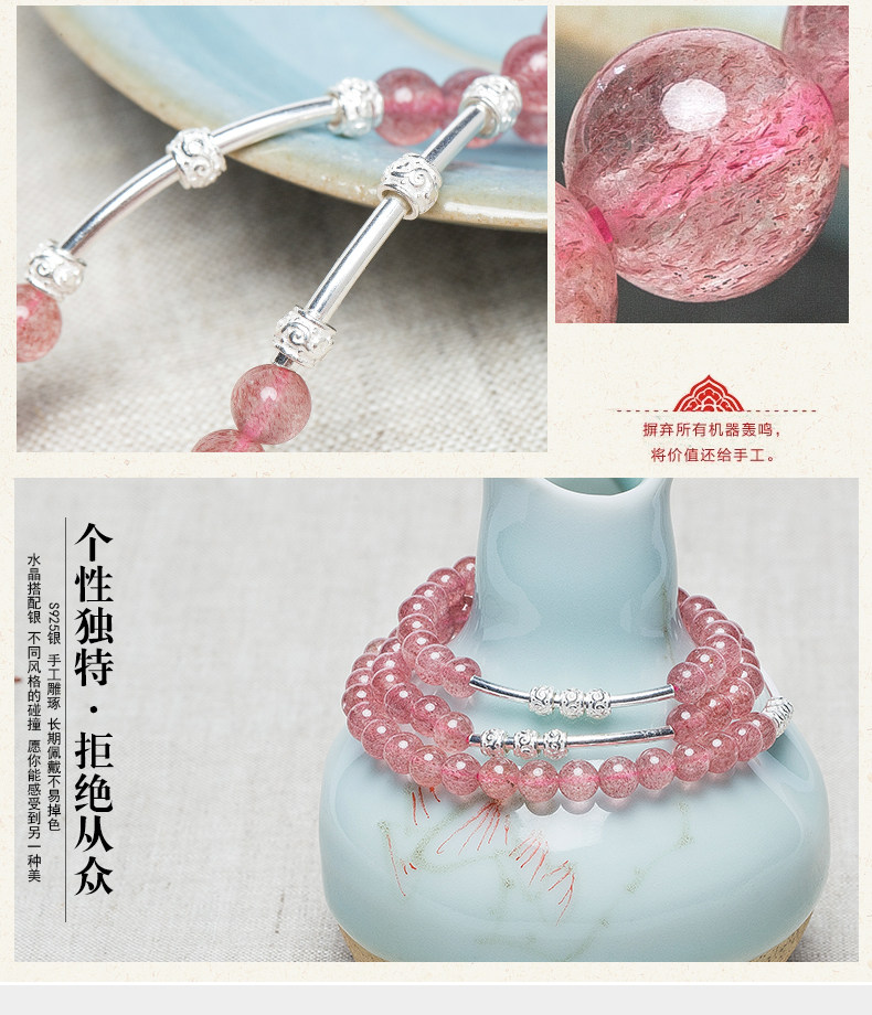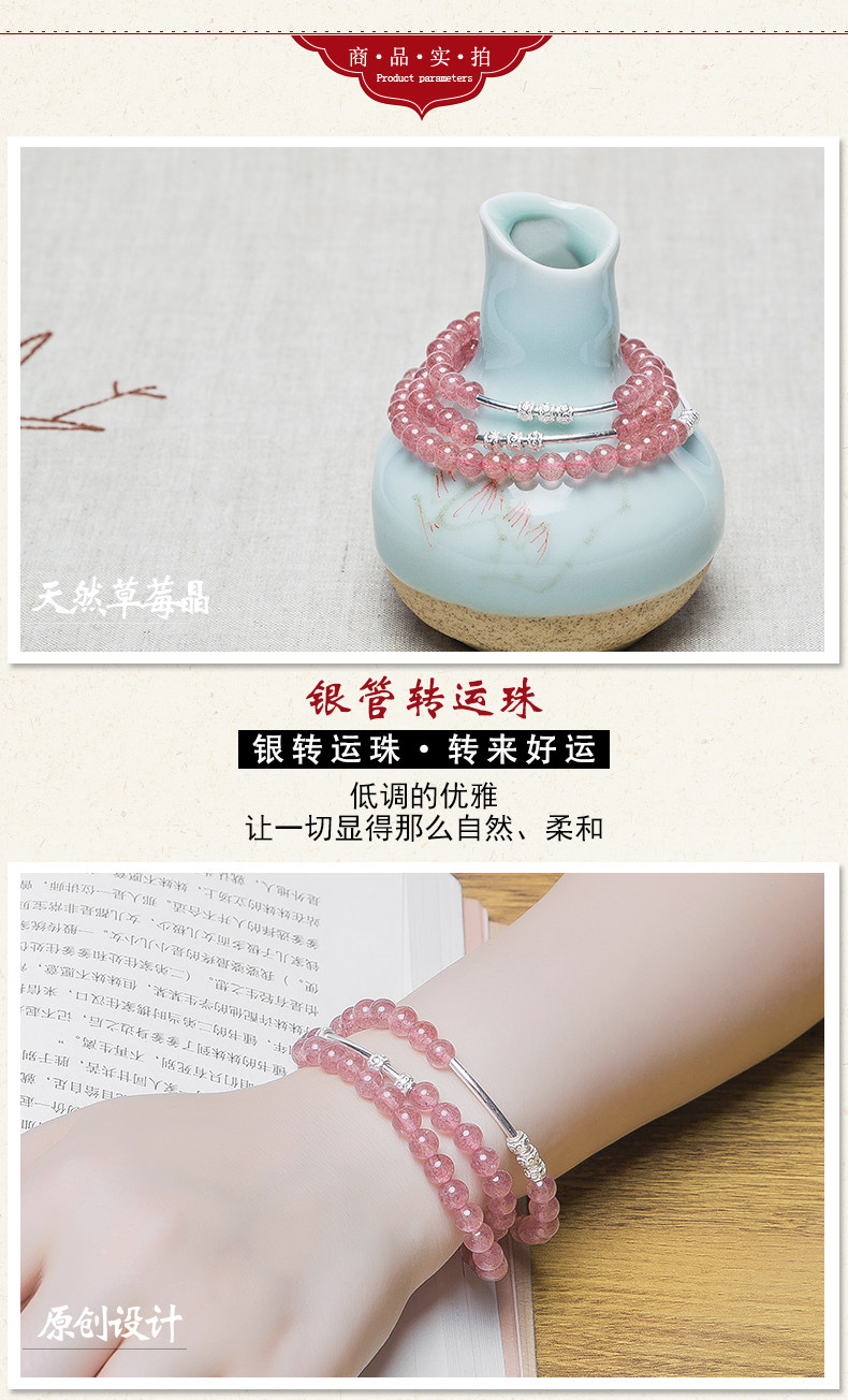 原创天然草莓水晶手链女转运925银珠饰品多圈手串节日礼物