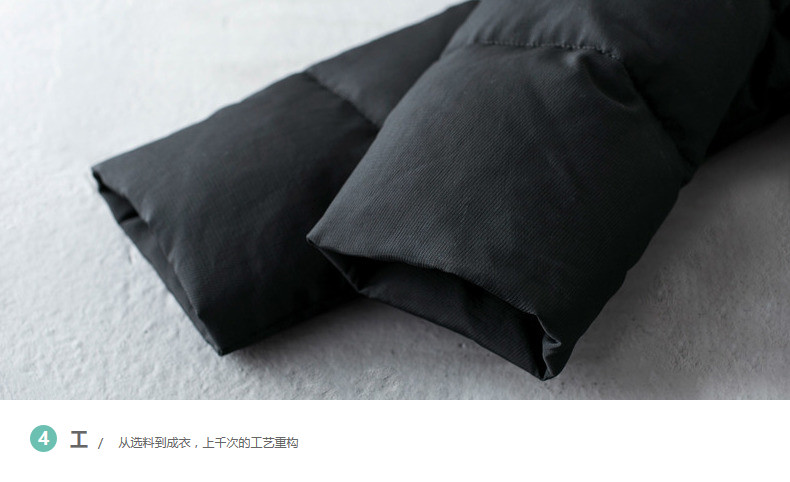 100%锦纶 配料:100%棉 里料:100%聚酯纤维 填充物:白鸭绒 含绒量:80% 充绒量:133.7g(S) 142.5g(M)151.3g(L)160.1g(XL)