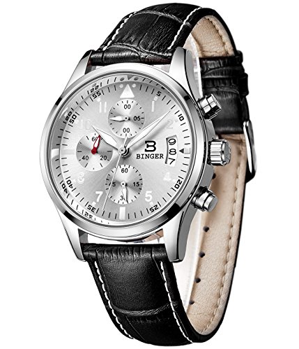 -. Title : BINGER 腕時計 メンズ ブラック本革バンド シルバー文字盤 シルバーケース 日付表示3時 三つの独立小さい文字盤 防水 9202A