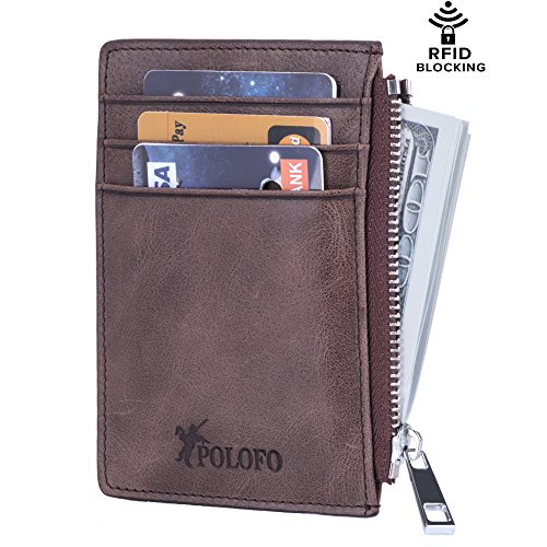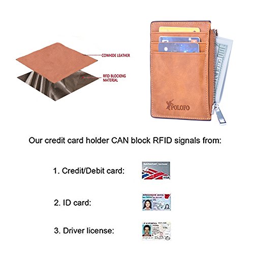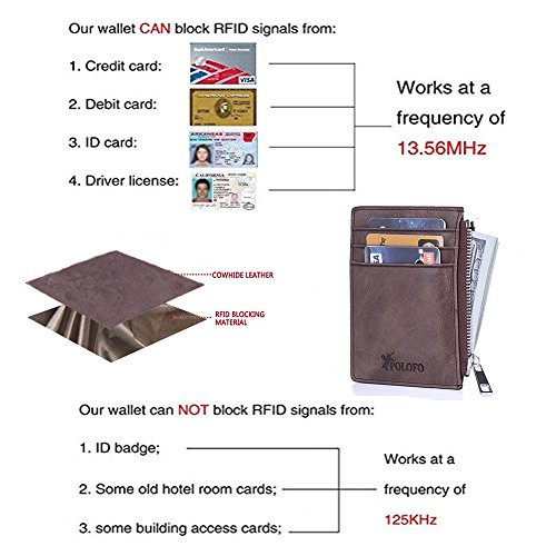 Binding : Apparel Product Description Features: - High quality 100% genuine leather - 3 card slots on front,1 ID or driver's license card at the back, 1 zippered Pouch for notes, cash, and coins - 4 3 /4" x 3 1/4" x 1/4" inches - RFID signal blocking Package Includes: - 1* Front pocket wallet - 1* POLOFO packing box - 1* Velvet bag About Us: - POLOFO is our company's original brand, specializing in providing customers high-quality and competitive price leather products. AAbout RFID - RFID: Radio-frequency identification, uses electromagnetic fields to automatically identify and track tags attached to objects. The tags contain electronically stored information. Our Credit/Bank/ID card, passport have encoded chips tags, and stored our personal/private information. So, we should protect them from information hacker and data thieves. - Data thieves can read your private data of cards at a distance of 10ft(3m), using a RFID scanner. Now, this RFID signal blocking wallet can protect your personal/private information safety. - This item can block signal from 10MHz to 30GHz. Credit/Debit/ID card, driver license, passport use the frequency of 13.56MHz. It won't block signal from ID badge, some old hotel room cards or building access cards, which use a frequency of 125 kHz.