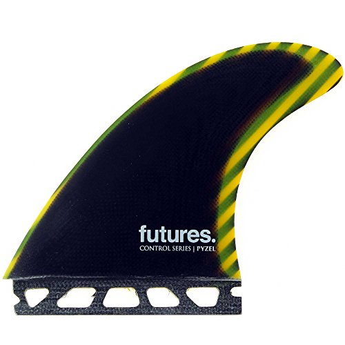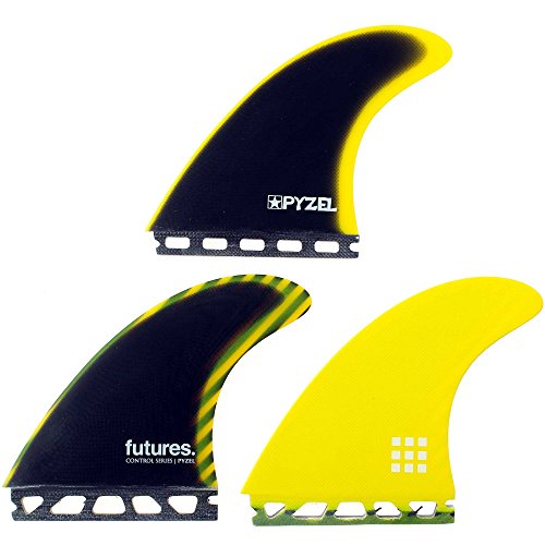 Studio : Futures Publisher : Futures Binding : Misc. Product Description Futures Pyzel Carbon Fiberglass Tri Fin Set. Fin Set Up: Thruster. Fin System: Futures. The Futures Pyzel thruster was designed by North Shore shaper Jon Pyzel with the powerful waters of Hawaii in mind. The Control Series construction of fiberglass and uni-carbon is stiff and durable making them ideal for controlling speed in heavy conditions. The Control Series are the lightest fiberglass fins Futures has ever made! The addition of carbon fiber has allowed for a slimmer profile which results in less weight drag without sacrificing control. Flat foiled fins break free sooner and are better at controlling speed. Often surfers prefer them in fast powerful surf where they do not need to create additional speed. If you have muscle memory from riding glass-ons flat foiled fins will feel the closest. Vendor style #: 112422100. Fin Specs: Size: Large. Rider's Weight: 80kg / 180lbs . SIDE: Base: 4.65. Height: 4.64". Area: 16.00". Foil: Flat. CENTER: Base: 4.65". Height: 4.64". Area: 16.00". Foil: Symmetrical. Construction: Fiberglass." 0