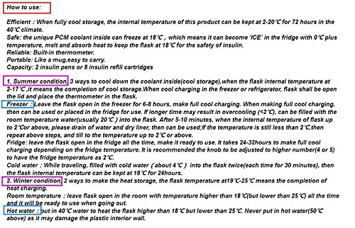 Safe: The unique PCM coolant inside can freeze at 18°C, which means it can become 'ICE' in the fridge with 0°C plus temperature, melt and absorb heat to keep the flask at 18°C for the safety of insulin