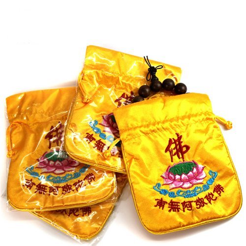 AUCH 10Pcs Deluxe Heavy Duty Drawstring Chinese Silk Embroidery Brocade Bags Buddha Beads Pouch Buddhism Lotus Bags, Golden Yellow