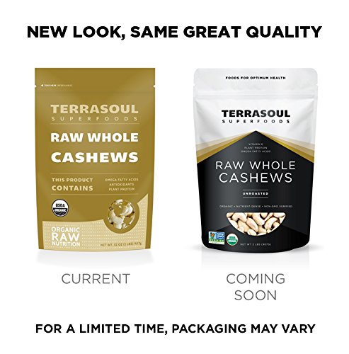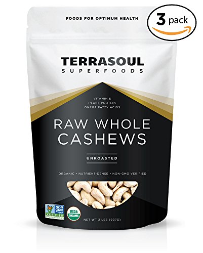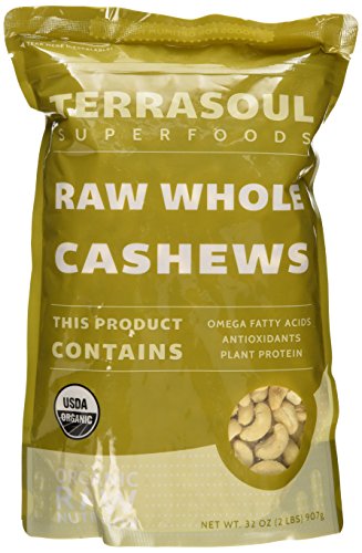 About Terrasoul Superfoods Organic Raw Whole Cashews: Raw cashew nuts contain a rich portfolio of extremely beneficial oils, including an ideal ratio of healthy saturated, monounsaturated and polyunsaturated fats. Raw cashews are also a great source of dietary trace minerals such as copper, iron and zinc. We use a low-heat harvesting process to remove the cashew from its hard outer shell to preserve valuable enzymes, healthy fats and the nut's delicate sweet flavor. Our raw Whole Cashews are the perfect choice for creamy raw desserts, granolas, nut milks, and many savory culinary creations.