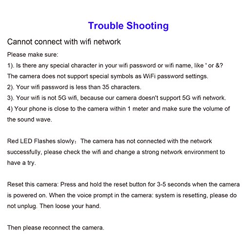 Quick and Easy setup: Using “Wi-Fi configuration” via Uokooer App so as to connect your Wi-Fi with camera in minutes, no complicated setting needed of this wireless surveillance camera. Built-in support for 802.11b/g/n 2.4Ghz (5Ghz currently not supported) Wi-Fi band.