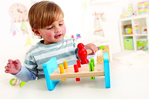 Practice basic building skills with this best-selling, innovatively designed toy from Hape. The First Pounder is perfect for every aspiring little carpenter who loves to play. Use the brightly colored hammer to drive each peg through the holes in the wooden base, then flip the set over and do it again. Encourages the development of coordination and fine motor skills as children aim and pound at each peg. Made with wood sourced from environmentally sustainable forests. Durable child-safe paint finish and solid wood construction make this a toy your child will love for years to come. Hape toys stimulate children through very stage of development and help nurture and develop their natural abilities. All Hape products sold in North America meet or exceed all applicable safety standards.