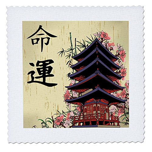 3dRose qs_116193_7 Beautiful Japanese Pagoda with Pink Sakura and Bamboo Destiny Luck Kanji Symbols Asian Design-Quilt Square, 18 by 18-Inch