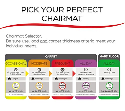 -. Binding : Kitchen -. Brand : Deflect-O -. Color : Clear -. Department : Office -. EAN : 0079916060415 -. Feature : Protective vinyl chairmat safeguards and protects carpets from wear and tear. / Medium weight chairmat for frequent use on carpets up to 1/2" thick, Medium Pile; choose a higher pile chairmat if usage is over 6 hours. / Easy-glide rolling surface provides effortless chair movement. / Studded, vinyl and beveled chair mat for medium weight carpeting / Maximum clarity and transparency, allowing the beauty of carpeting to show through / Smooth beveled edges for easy roll on and roll off / Textured top surface is slip and scuff-resistant / Unique notched stud design grips carpet without piercing or harming carpet backing -. Label : United Stationers -. Manufacturer : United Stationers -. Model : CM14233 -. MPN : DEFCM14233 CM14233 -. NumberOfItems : 1 -. PackageQuantity : 1 -. PartNumber : DEFCM14233 CM14233 -. ProductGroup : Furniture -. ProductTypeName : HOME_FURNITURE_AND_DECOR -. Publisher : United Stationers -. Size : 45 by 53-Inch -. Studio : United Stationers -. Title : deflecto CM14233 Beveled Clear 45x53 w/Lip Medium Pile Carpet SuperMat Frequent Use Chair Mat -. UPC : 079916060415 -. Warranty : Manufacturer's limited lifetime guarantee against chipping, breaking and shattering
