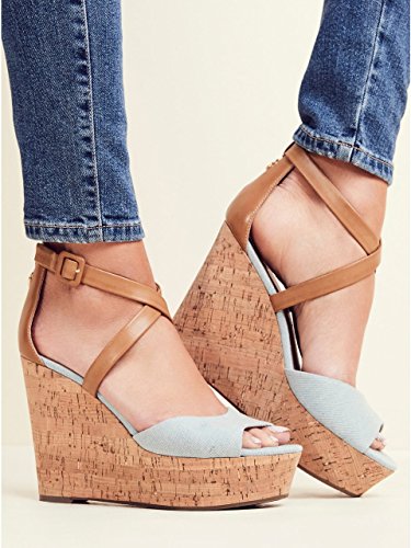 Product DescriptionPerfect for adding glamour to a more casual look, these platform espadrilles feature a light-wash denim with a contrast faux-leather design, peep-toe and crisscross ankle straps.0