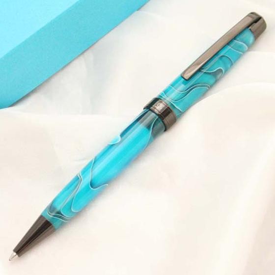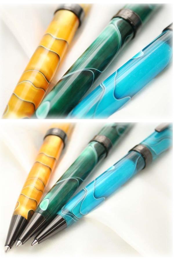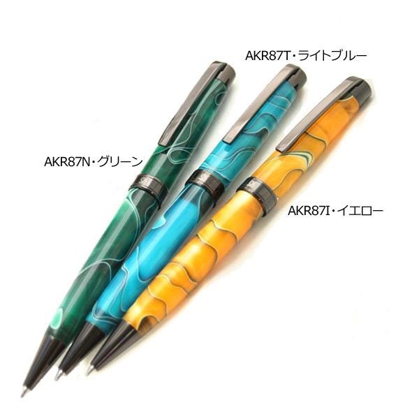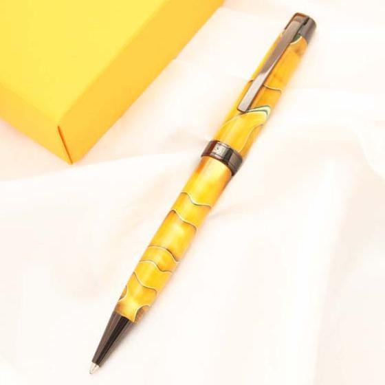 独特なデザインが印象的なボールペンです。なんともいえないデザインにペン先やペン尻部分の黒がアクセントになり引き締めてクールに見せてくれます。ボディの上部を回すとペン先が出るタイプです。カラーはイエロー、グリーン、ライトブルーの3種類からお選びいただけます。専用のボックスに入っていますので、プレゼントにもぴったりです。 |