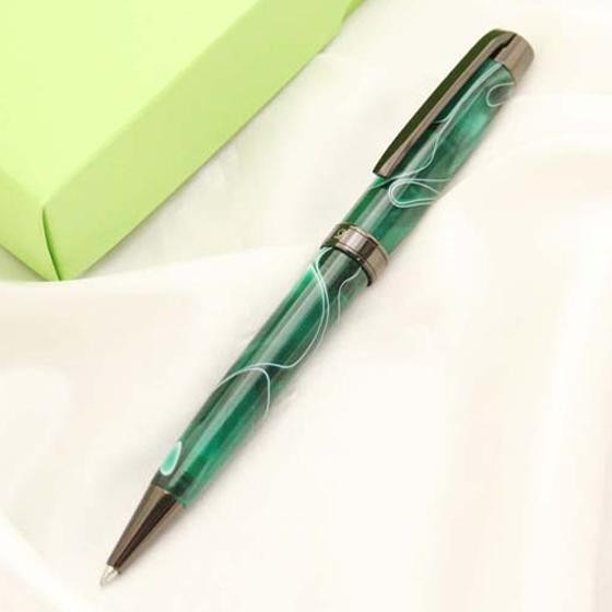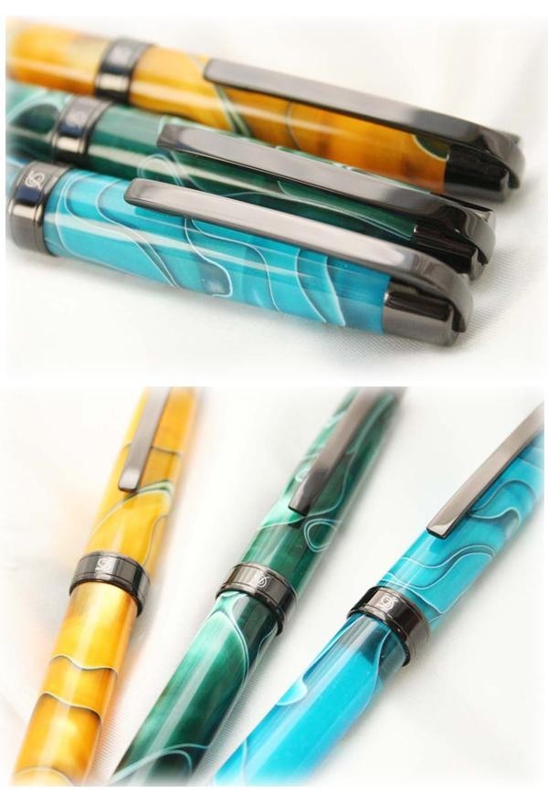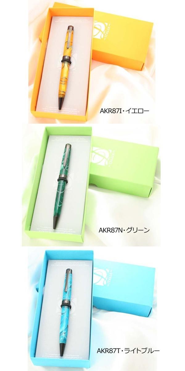 | 独特なデザインが印象的なボールペンです。なんともいえないデザインにペン先やペン尻部分の黒がアクセントになり引き締めてクールに見せてくれます。ボディの上部を回すとペン先が出るタイプです。カラーはイエロー、グリーン、ライトブルーの3種類からお選びいただけます。専用のボックスに入っていますので、プレゼントにもぴったりです。 |