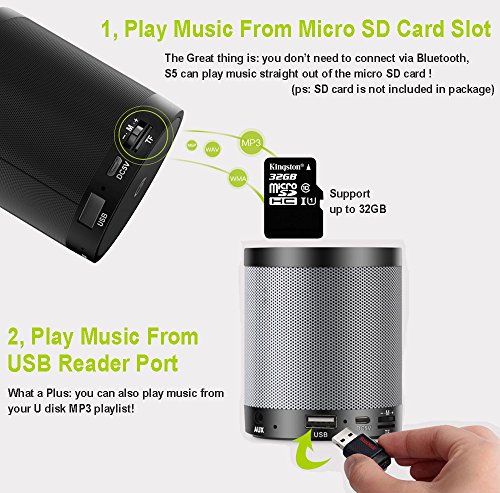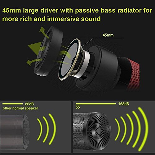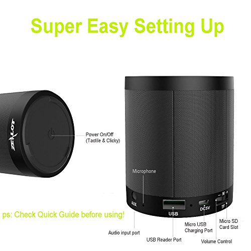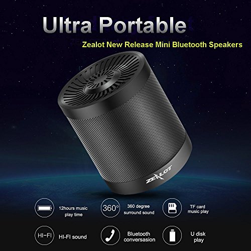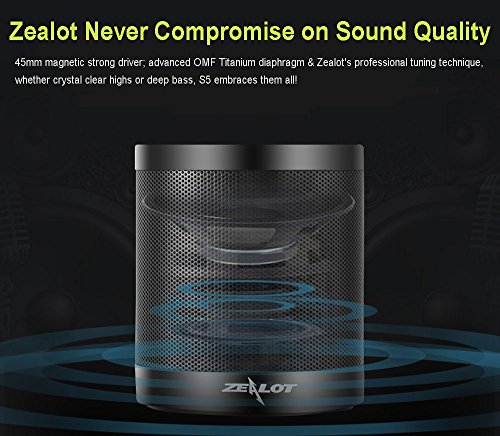 -. Feature : Built-in 45mm large speaker combined with vibrating diagram applying Zealot's professional tuning technique, Ironman S5 is a mini yet powerful wireless speaker with gorgeous timbre / Iron body with exquisite detail resolvement brings simplicity, yet not simpler. Even larger volume than S1 with smaller body to crank your room / Long playing time: Built-in 2000mAh battery, which can last for up to 10 hours on a single charge / 3.5mm stereo jack can connect Audio player (desktop PC, laptop, tablet, and etc.) without connecting via Bluetooth function / Bluetooth4.0 Technology works with virtually any Bluetooth-Enabled Device (Smart phones, Tablets, PC)