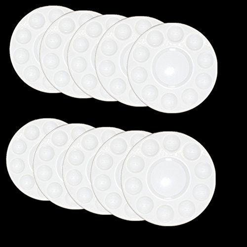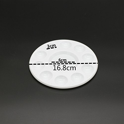 -. Feature : Made of molded white plastic, it is durable and easy to clean. / Size:Please look at the picture. / Ideal for distributing paint. / Package includes 10 of Round Paint Tray Palette / Round plastic palette contains 11 shallow wells.