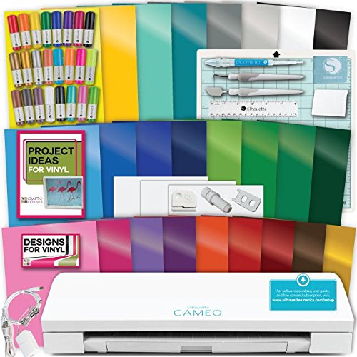 - Includes a brand new Silhouette Cameo 3 Machine, a 24 pack of Silhouette Sketch Pens, a mega pack of adhesive backed vinyl, hook, scraper, spatula and quick pick up tool, 12 exclusive Craft-e-Corner vinyl designs with 12 full project tutorials, inspiration and tips and tricks for working with vinyl.