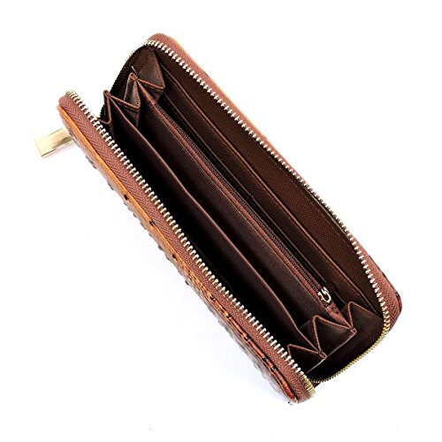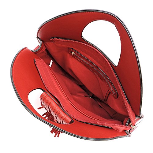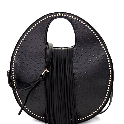 - Lead Free Vegan Leather Material, Ostrich Embossed - Golden Studs and Hardware - Long Leather like Fringe - Zipper Top Closure - Semi Adjustable Crossbody/Shoulder Strap Inside: - Coordinating Cotton/Polyester Lining - Zipper wall pocket, 2 Open Wall Pockets