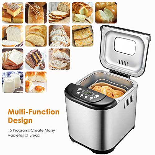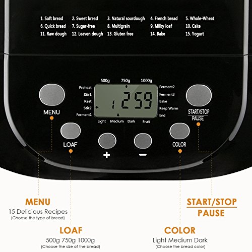 Large Capacity & Different Flavors - Up to 2.2 pounds loaf capacity, the LCD display allows you to choose 3 bread sizes (1.1 lb, 1.65 lb, 2.2 lb) and 3 bread colors (light, medium, dark), ideal bread machine for modern family, instructions with recipes included.