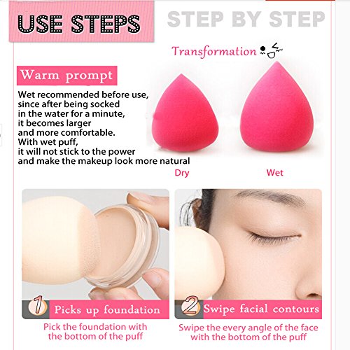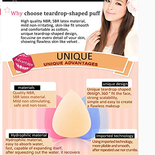 Feature: Give you a flawless foundation application every single time. No streaks and no areas with too much makeup or too little. latex free, non-allergenic and odor free Will not lost its shape or had any nicks or dings for year's use. It is very thick and smooth compare with the one with lots of small holes. With Vitamin "E" in it. How to use: Use its pointed side for hard-to-reach spots like around the nose and mouth, and under the eyes. Use the round base for foundation and blush on the larger areas of your face such as your forehead, cheeks and chin. You can use it with liquid or pancake foundation If used daily, we recommend washing your sponge once a week with a mild cleanser. Baby shampoo or any low sudsing soap will work. Rinse well and air dry. On the foundation of time can well fit the contours of the face to face, take care of every part to make on the foundation changed very relaxed and efficient. Using this tool, even without makeup experience of novice can easily put makeup on thin, uniform and docileFeature