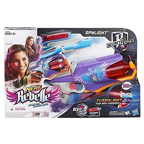 -. Binding : Toy -. Brand : Nerf N-Strike Toys -. EAN : 0719279403114 -. Feature : Ships from United States. Estimated Delivery Time: 5-8 days / Tested for quality and durability Spylight blaster has a removable flashlight that reveals secret messages / High quality toys for children all ages Made using safe materials / TRemovable decoder decodes messages in the included 3 Message Darts Fires Message Darts and the 3 collectible darts up to 75 feet / Secret Spy compartment in the handle holds 2 darts -. IsAdultProduct : 0 -. Label : Nerf N-Strike -. Manufacturer : Nerf N-Strike -. ProductGroup : Toy -. ProductTypeName : TOYS_AND_GAMES -. Publisher : Nerf N-Strike -. Studio : Nerf N-Strike -. Title : Nerf Rebelle Spylight Fire the included 6 Darts Blaster Toys -. UPC : 719279403114
