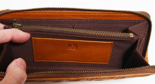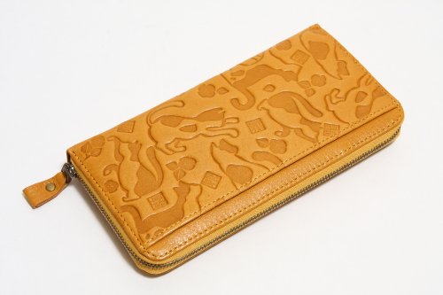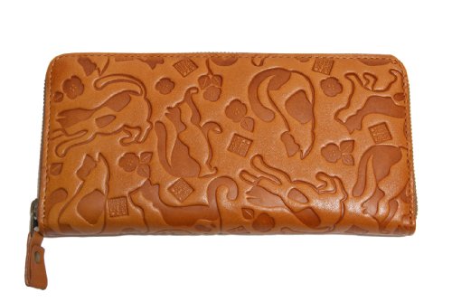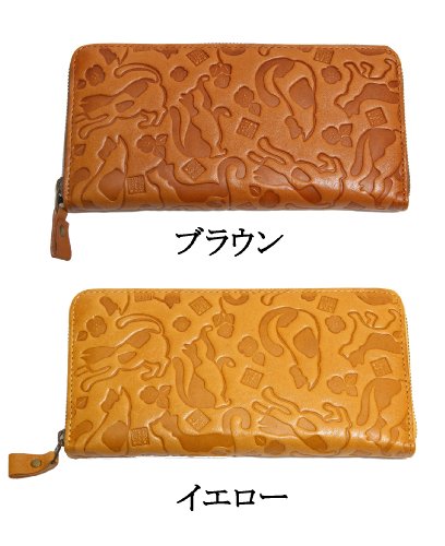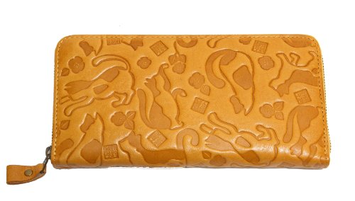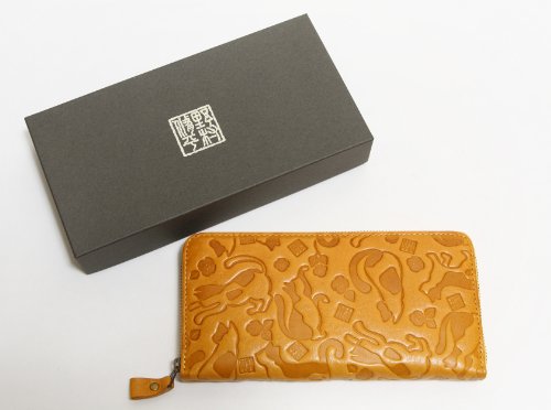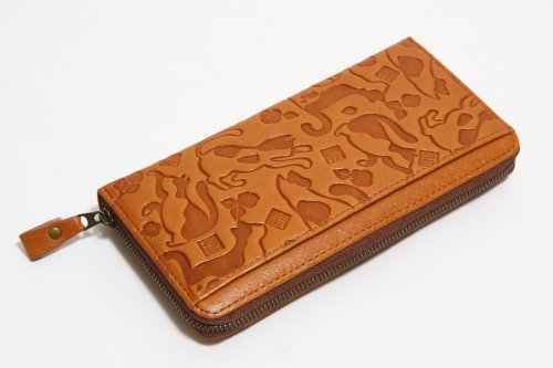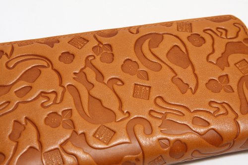 -. Feature : 猫柄の型押し財布です。 / サイズ:幅19.0cm 高さ9.5cm 厚み2.0cm / 素材:牛革 / 背面差し込みポケット×1 ・マチ付き札入れ×2 / カードポケット×13 ・差し込みポケット×2 ・ファスナー小銭入れ