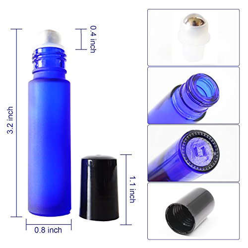 - Complete Bundle - 12x 10ml/0.33oz Empty Glass (6x Blue Matt + 6x Clear Matt) Roll-on Bottles with lids w/ free 2x 3ml droppers + 2x mini funnels + extra 6 roller balls + 2x essential oils bottle openers + 24 pieces labels