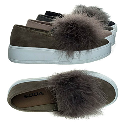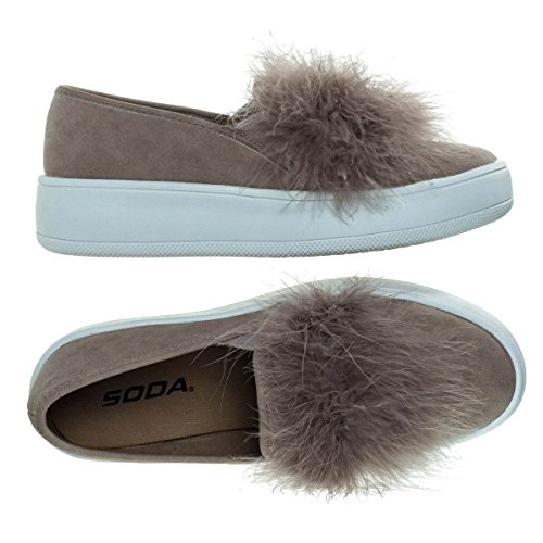 Binding : Apparel Product Description About This Shoes :These comfortable fashion sneakers features a thick rubber platform, rounded toe, slip on elastic, lightly padded sole and faux fur pom pom. Brand - Soda Colors Available: Taupe, Gray, Black, Mauve Pink Occasion: Casual Shoe Type: Oxfords Shoe Style: Oxfords Inner Lining: synthetic Heel Height In Inches - 0.25 Heel Style - Wedge Toe Style - round-toe Platform Height In Inches - 0.25 Shaft Height In Inches - n/a Circumference Opening - n/a Strap Type - strapless Sole - manmade All Man Made Material unless otherwise stated. Computer/Phone/Table monitors might show color differently because of its quality or calibration, we suggest you look at the photo in at least 3 monitors if you need exact color match of your shoes. 0