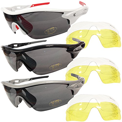 - Feature : Lightweight sports sunglasses complete with 3 interchangeable lenses, carry pouch and PVC box. / 3 lenses include Smoked (for bright conditions), Yellow (for low light) and Clear (for wet/dull conditions) / Durability and all-day comfort due to the lightweight, stress-resistant frame material / Integrated 'cool' ports to channel airflow for comfort and cooling / High Definition Optics for clarity, visual fidelity and impact resistance that pass all EN ISO 12312-1:2013 standards