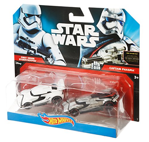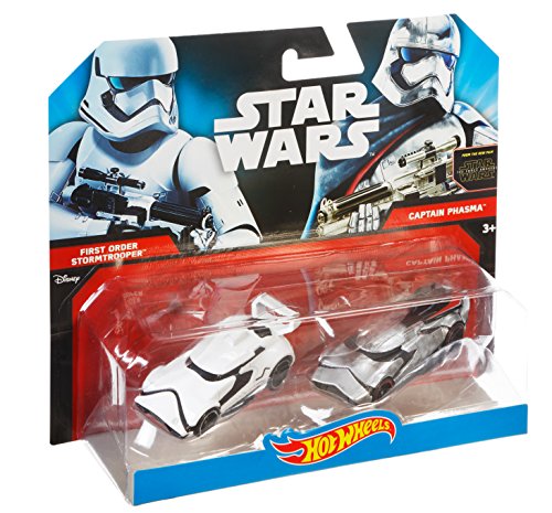 -. Binding : Toy -. Brand : Hot Wheels -. Color : Multi -. EAN : 0798627266717 -. Feature : Collect and play with a galaxy of Hot Wheels Star Wars cars / Pairs of iconic Star Wars characters reimagined as Hot Wheels cars / Authentic and highly collectible / Designed in 1:64-scale with true-to-character features and decos / Makes a great gift for fans of all ages -. IsAdultProduct : 0 -. ItemPartNumber : CLK35 -. Label : Hot Wheels -. Manufacturer : Hot Wheels -. Model : CLK35 -. MPN : CLK35 -. PackageQuantity : 1 -. PartNumber : CLK35 -. ProductGroup : Toy -. ProductTypeName : TOYS_AND_GAMES -. Publisher : Hot Wheels -. Size : Standard -. Studio : Hot Wheels -. Title : Hot Wheels Star Wars: The Force Awakens Character Car 2-Pack, First Order Stormtrooper vs. Captain Phasma -. UPC : 887961137606 -. Warranty : 1 year warranty against manufacturer defects