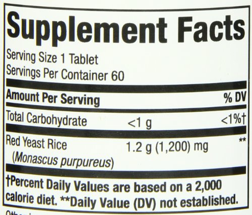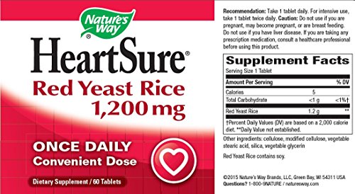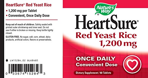 -. Binding : Health and Beauty -. Brand : Nature's Way -. Department : Health and Beauty>Health and Wellness -. EAN : 0033674152843 -. Feature : Nature's Way -. IsAdultProduct : 0 -. IsAutographed : 0 -. IsMemorabilia : 0 -. Label : Nature's Way -. LegalDisclaimer : * These statements have not been evaluated by the Food and Drug Administration. This product is not intended to diagnose, treat, cure or prevent any disease. ** Always refer to the manufacturer's label on the product for description, recommended dose and precautions. -. Manufacturer : Nature's Way -. Model : 15284 -. MPN : 15284 -. NumberOfItems : 1 -. PackageQuantity : 1 -. PartNumber : 15284 -. ProductGroup : Health and Beauty -. ProductTypeName : HEALTH_PERSONAL_CARE -. Publisher : Nature's Way -. ReleaseDate : 2010-05-13 -. Size : 60 -. Studio : Nature's Way -. Title : Nature's Way HeartSure Red Yeast Rice 1200mg, 60Tabs -. UPC : 033674152843
