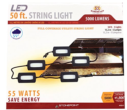 - 50 Foot String Light Consisting of 5 High Intensity Light Heads with Virtually Indestructible LEDs - 5000 Total Lumens Total, 1000 per head (40,000 hrs LED life)