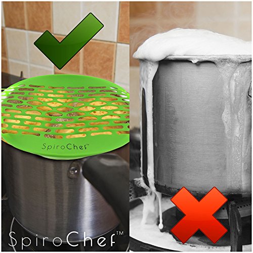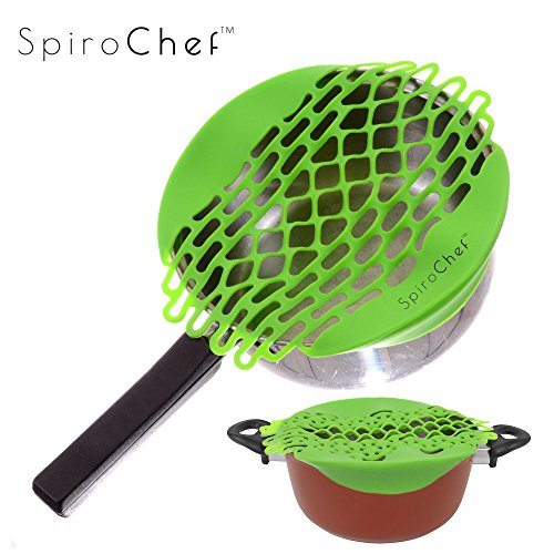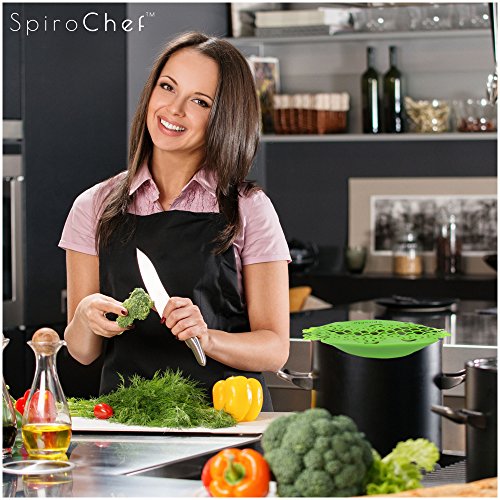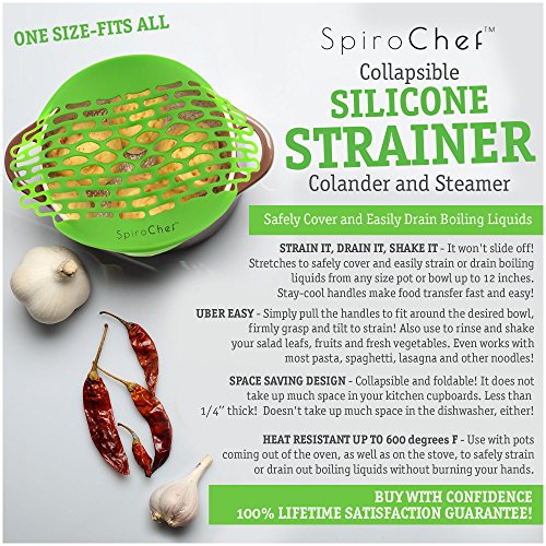 - Feature : STRAIN IT, DRAIN IT, SHAKE IT - It won't slide off! Stretches to safely cover and easily strain or drain boiling liquids from any size pot or bowl up to 12 inches. Stay-cool handles make food transfer fast and easy! / UBER EASY - Simply pull the handles to fit around the desired bowl, firmly grasp and tilt to strain! Perfect for draining spinach, broccoli, green beans, potatoes, carrots, spinach, or other veggies. Also use to rinse and shake your salad leafs, fruits and fresh vegetables. Even works with most pasta, spaghetti, lasagna and other noodles! / SPACE SAVING DESIGN - Our amazing strainer is both collapsible and foldable, so it does not take up much space in your kitchen cupboards. Strainer is less than .25 inches thick, yet strong enough to stand up to even the hottest and heaviest food items, like boiled potatoes or broccoli. Doesn't take up much space in the dishwasher, either! / HEAT RESISTANT UP TO 600 degrees F - Use with pots coming out of the oven, as well as on the stove, to safely strain or drain out boiling liquids without burning your hands. / BUY WITH CONFIDENCE - Every SpiroChef (TM) product carries a 100% LIFETIME SATISFACTION GUARANTEE!