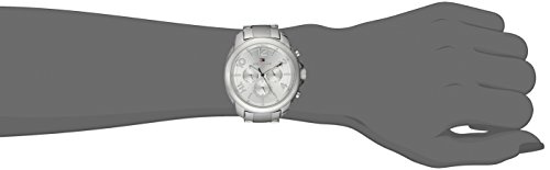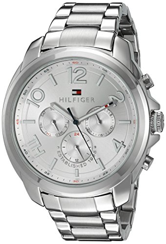 Dress watch, Japanese quartz movement, Multifunction featuring 24-hour, day and date subdials, Polished silver-tone hands with white accents, Glossy blue sweep seconds, Polished silver-tone hands mark subdials, Applied polished silver-tone Arabic numbers with white accents, Applied polished silver-tone markers with white accents, Applied polished silver-tone 'TH' logo with white accents, Black print, Arabic numbers and indices mark subdials, Navy/red Arabic numbers and black indices form minute track, Brushed silver-tone dial with glossy red/white/navy flag logo applique, Polished silver-tone stainless steel bracelet with brushed inserts, adjustable links and push-button-clasp, Polished silver-tone stainless steel bezel, Oversize polished silver-tone stainless steel round case, Stainless steel crown, Stainless steel selector buttons, Stainless steel caseback, Mineral crystal, 3 ATM (30 meters/100 feet water resistant)Feature