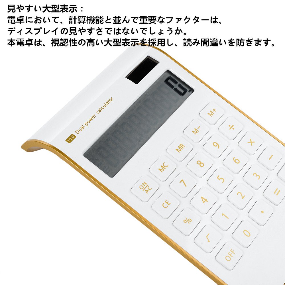 見やすい大型表示:電卓において、計算機能と並んで重要なファクターは、ディスプレイの見やすさではないでしょうか。本電卓は、視認性の高い大型表示を採用し、読み間違いを防ぎます。また、フラットなデザインがおしゃれなアクリルパネルは液晶をしっかり保護してくれます