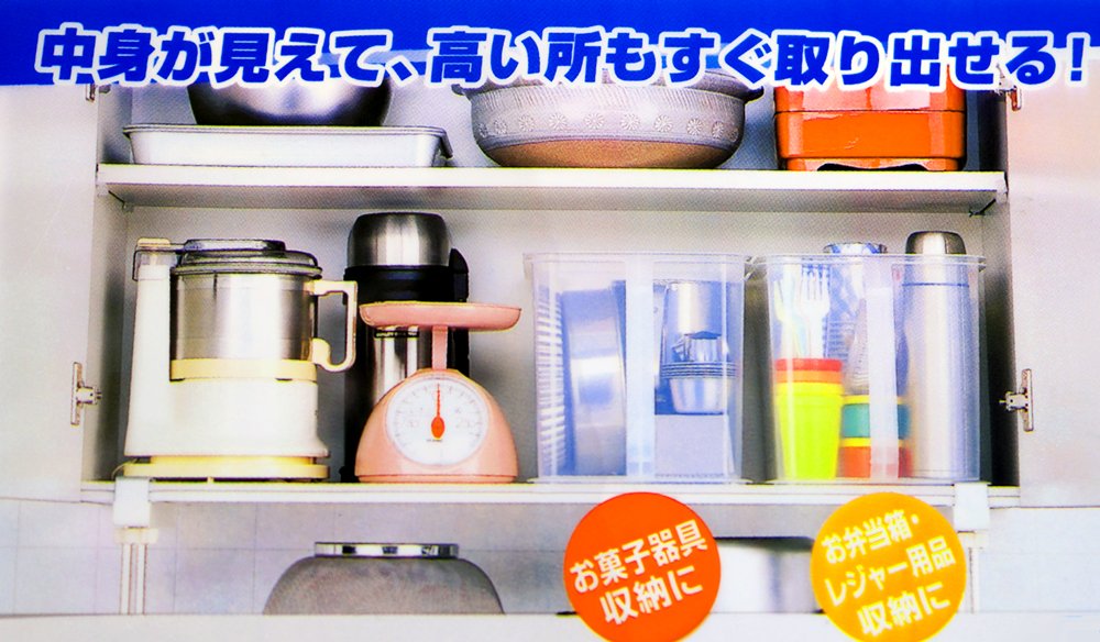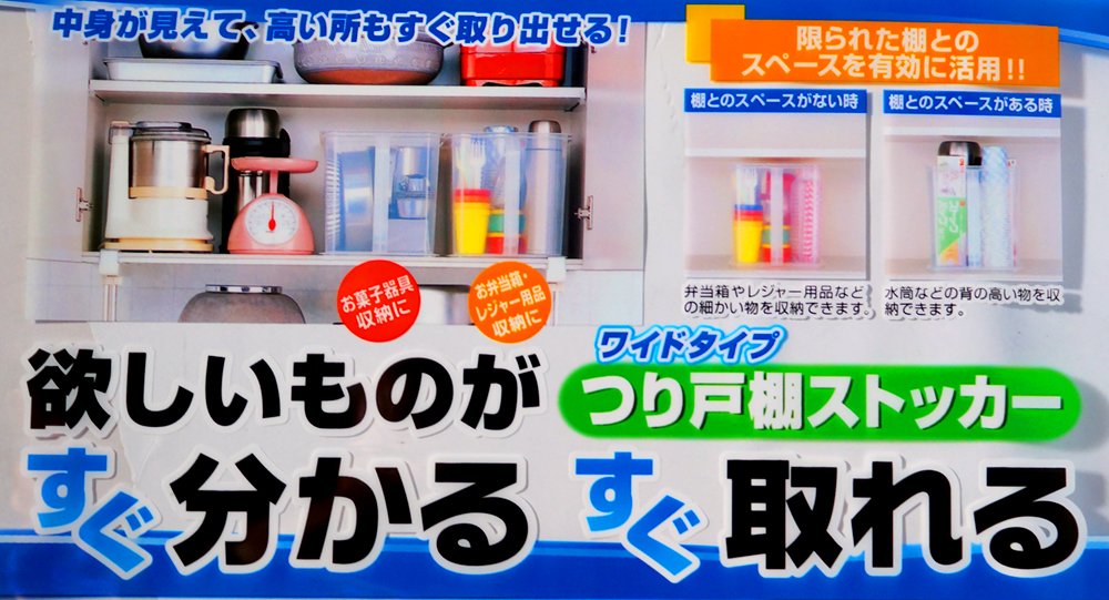"Hanging cupboard Stocker Wide" is a kitchen storage good that easy to take out items of high places with large handles attached