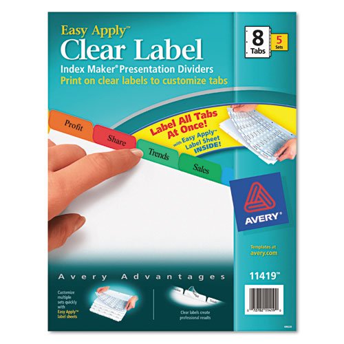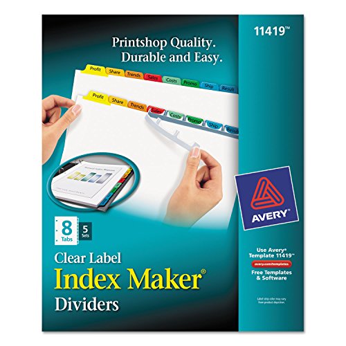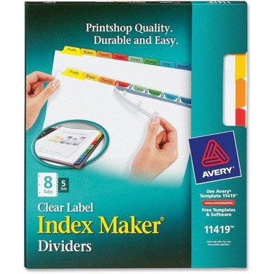 Studio : Avery Publisher : Avery Binding : Office Product Product Description Add color to your presentations and organization projects Clear labels virtually disappear when applied to the bright colored tabs, giving your dividers a professional, printed-on look. Save time by labeling all tabs at once using the Easy Apply label strip. Create tab labels quickly and easily using free Avery design tools and templates. For laser and inkjet printers. Tab Style: 8-Tab Tab Colors: Multicolor Index Divider Size: 11 x 8 1/2 Form Quantity: 5. 0