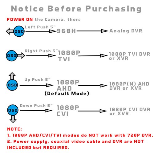 -. Feature : CRISP IMAGE: 1/2.9-inch Sony Exmor sensor for crystal clear image. Low Illumination, DWDR, 3DNR and multiple OSD adjustments for optimal picture quality. / ENHANCED NIGHT VISION: Latest anti-reflection black film technology, IR filter and upgraded SMT Led with 100ft Long range IR for superior image at night. / GREAT LOW LIGHT IMAGE: SONY Exmor Image sensor with NIR and LOW ILLUMINATION technology applied, it performs great image with little ambient light. / 4 MODES VIDEO OUTPUT: 1080P HD-TVI, 2.0MP HDCVI, 1080 AHD and 1000 TVL wired bnc output. / PEACE OF MIND WARRANTY: 60 DAY money back guarantee, 24 MONTH warranty and friendly, easy-to-reach support.