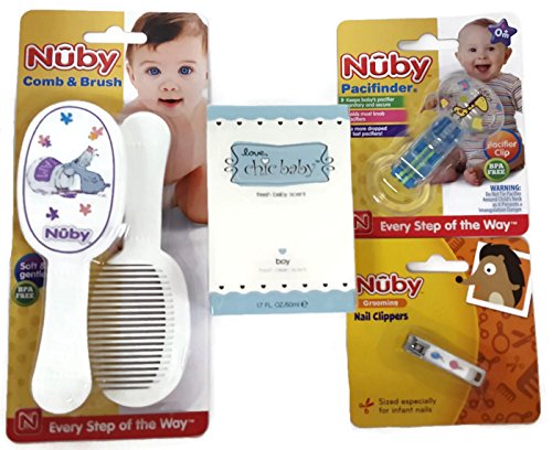 -. Feature : Bundle of 4 Items - GIFT SET FOR BOYS - unboxed / 1. Love Chic Baby Boy Fresh Scent, 1.7 oz. / 2. Nuby Brush and Comb Set - soft and gentle, BPA free - image on brush may vary (mouse, alligator) / 3. Nuby Pacifinder Pacifier Clip - BPA free - holds most knob pacifiers - color may vary (blue, aqua, green) / 4. Baby grooming nail clippers - sized especially for infant nails