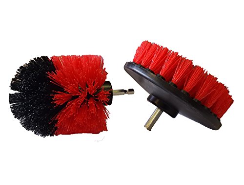 ATTACH TO ANY HOUSEHOLD DRILL: One red 5 inch stiff flat brush, for cleaning and scrubbing flat horizontal and vertical surfaces. One corner and edge brush for all your hard to reach places.